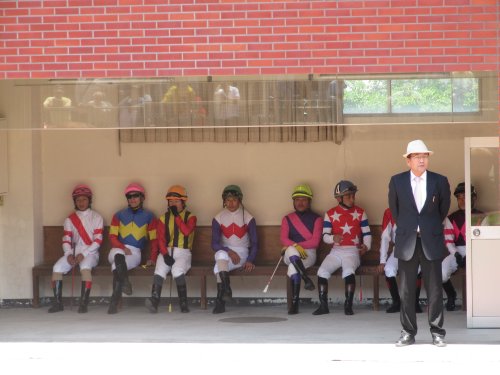 騎手たちも騎乗するまでの間、このように長椅子に座ってのんびりしている。